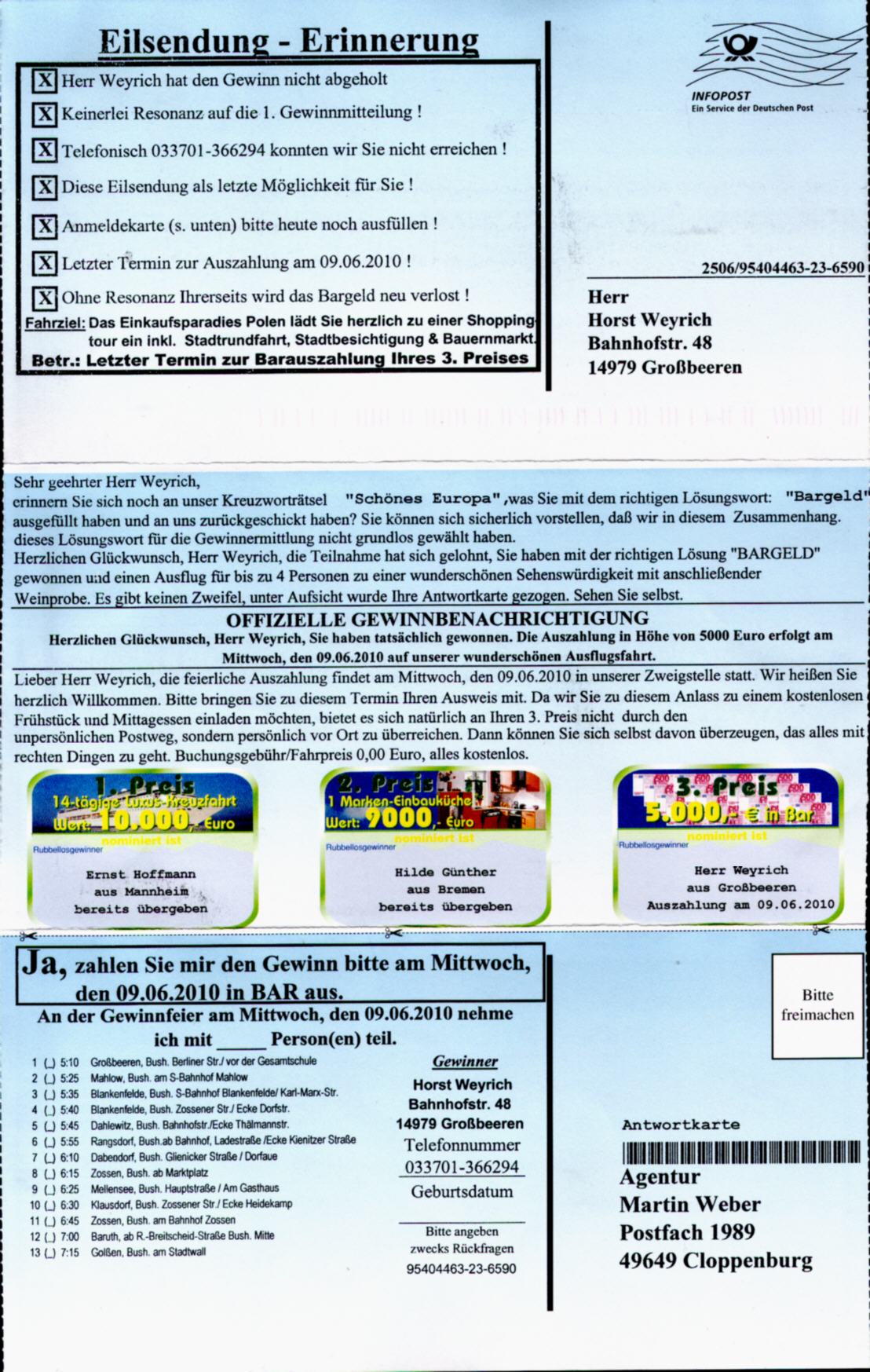 Ich hab heute auch so eine Karte erhalten, normalerweise sollte man ja seine 45 Magnum einpacken und mit paar Bodyguards da hin fahren und den Gewinn einfordern!!! Auch mit Gewalt da hätte ich keine Skrupel, nur schade das ich keine 45´er habe.