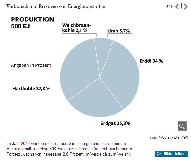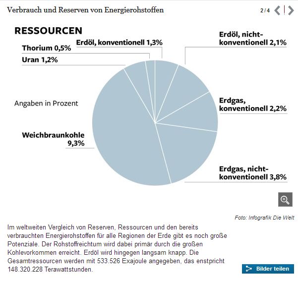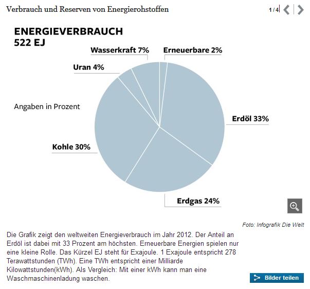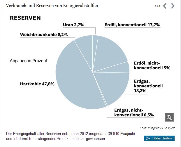 | Der weltweite Energieverbrauch 2012 betrug also 522 ExaJoule. Aus dem Begleittext der nächsten Grafik sieht man das weltweite Gesamtvorkommen 2012 - ausreichend für 533.526 ExaJoule. Das bedeutet bei gleichem Verbrauch kommen wir noch 1022 Jahre aus bis alles verbraucht ist: Ende von "Energie" für die Menschheit. Ich weiß aber auch nicht, ob man die Luft dann noch atmen kann, wenn Kohle, Erdgas und Erdöl nicht mehr im Boden sondern komplett als Kohlendioxid in der Luft sind. | |