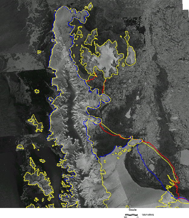 the northern end of the Larsen Ice Shelf. The blue line shows the