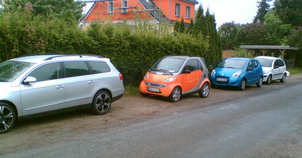Da ich in einem Single-Haushalt in Großbeeren wohne, brauche ich die Parkplatzsituation nicht mehr zu belasten als es ein kurzer Smart tut (über 90% aller Autofahrten werden von nur einer Person im Auto durchgeführt) und habe diese Entscheidung auch aus Rücksicht auf meine Hausmitbewohner gefällt, die mehrere Kinder haben und ein großes Auto und mehr Parkplatz brauchen, habe auch zwei Jahre lang ganz ohne Auto gelebt.