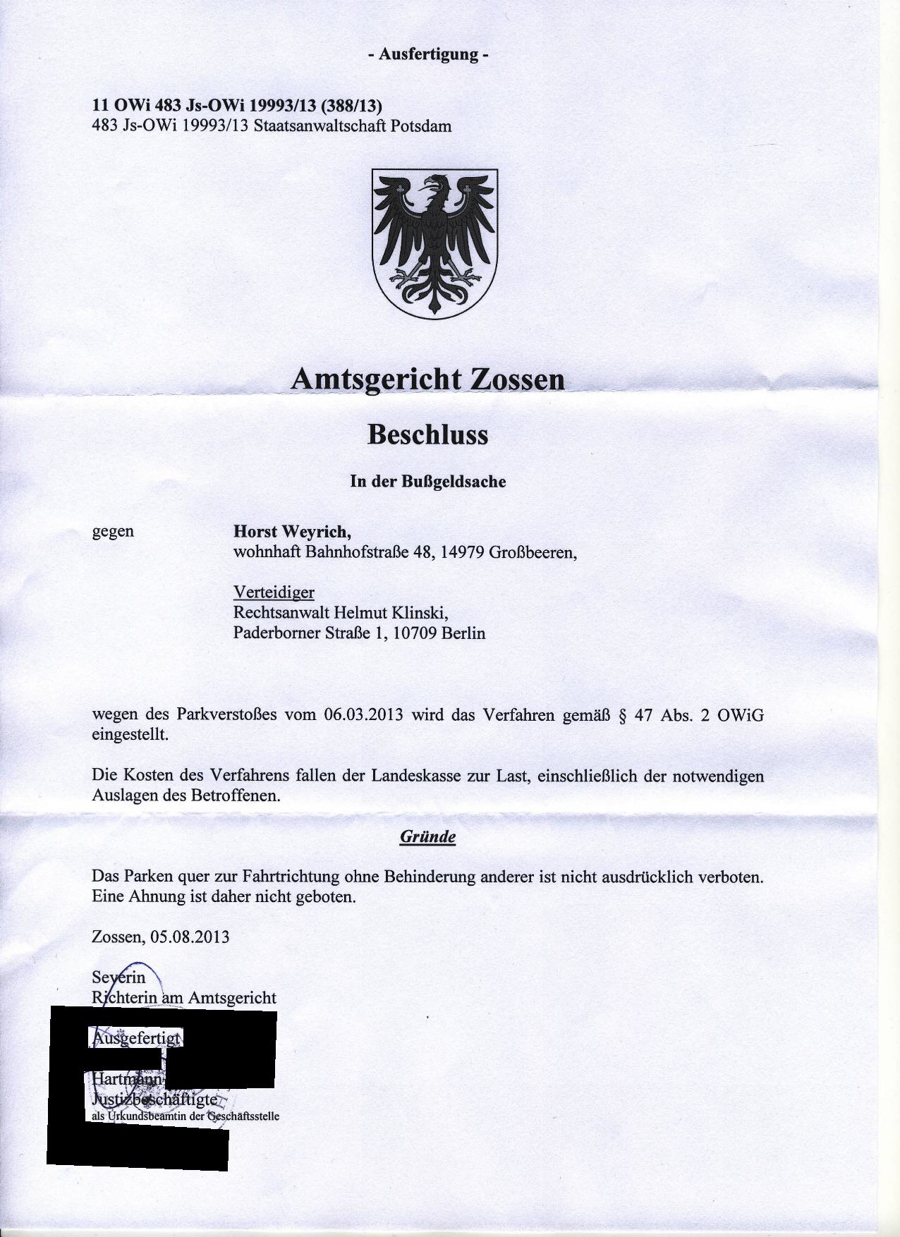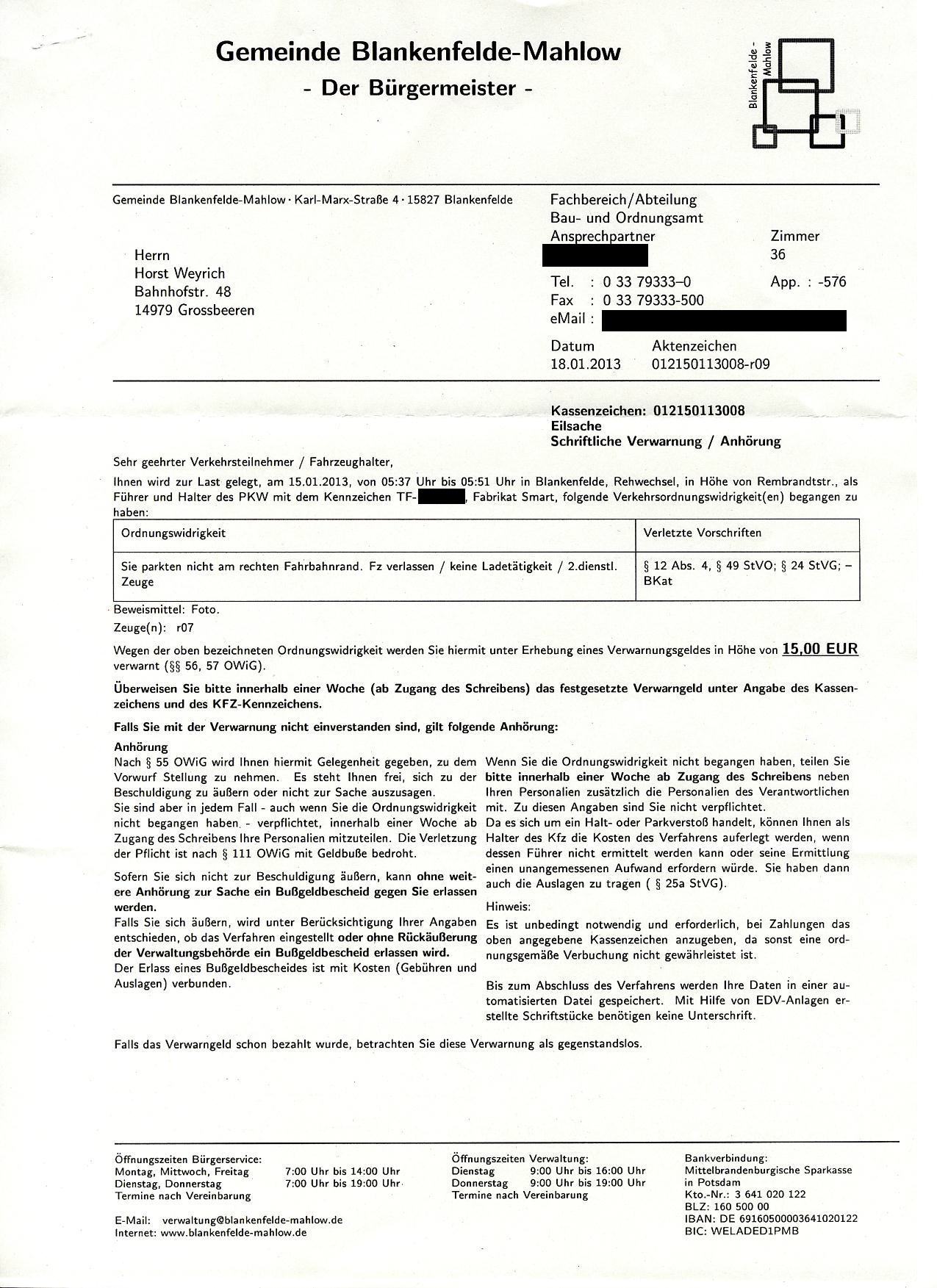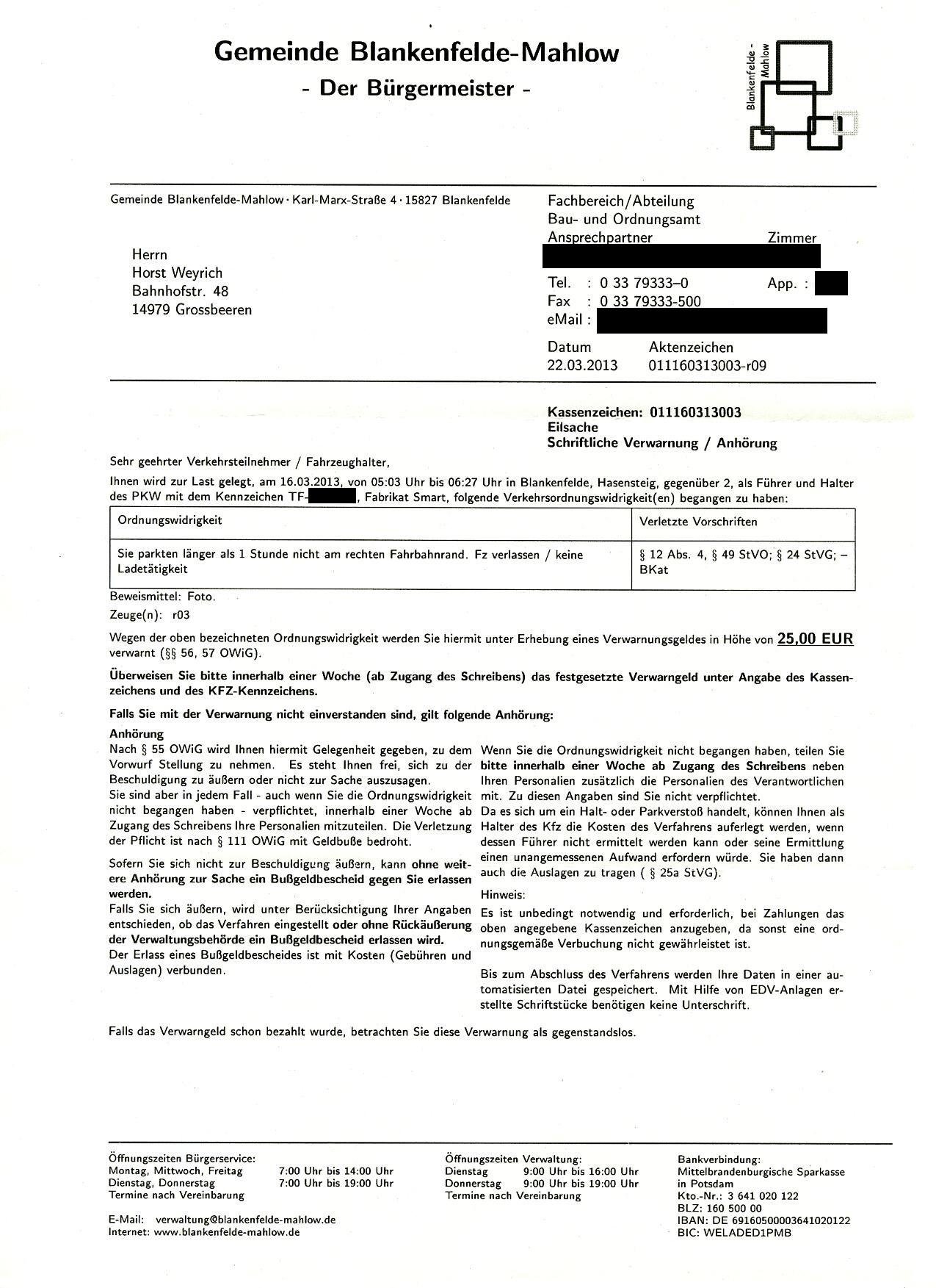 Ich habe die 15 Euro Verwarnungsgeld am 22.05.2013 überwiesen und werde von nun an nicht mehr platzsparend querparken. Ich weiß, daß es auch wenig Sinn machen würde gegen diese Ordnungswidrigkeit anzugehen, denn als ich am 04.05.2013 abends parkte, war die Straße vollgeparkt und als ich am 06.05.2013 morgens zum Auto kam, war es das einzige Auto weit und breit - und dann auch noch quergeparkt - und an diesem Morgen wurde die Ordnungswidrigkeit zur Last gelegt. Und ich habe einfach keine Lust immer Park-Fotos zur Verteidigung zu machen. Es ist einfach, jedes Wochenende einen Strafzettel unter den Scheibenwischer zu schieben. Schwieriger ist es an andere Parkplatzsuchende zu denken, sie zu berücksichtigen und dann zum Wohle der Gemeinde von der Gemeinde Blankenfelde-Mahlow mit Zahlungen bestraft zu werden.