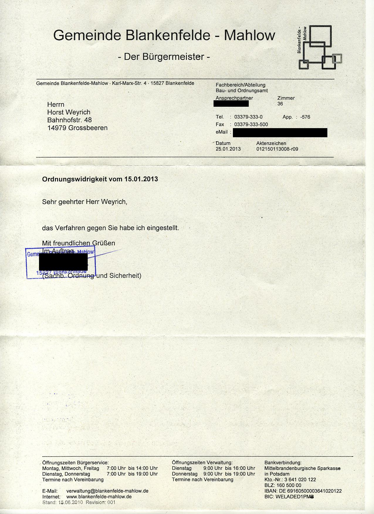 Sollte seitens der Gemeinde Blankenfelde-Mahlow darauf bestanden werden, daß es sich um eine zu ahndende Ordnungswidrigkeit handelt, werde ich unter Berücksichtigung der vorliegenden Rechtslage selbstverständlich den Rechtsweg bis in die höchstzulässigen Instanzen beschreiten. Mit freundlichen Grüßen
