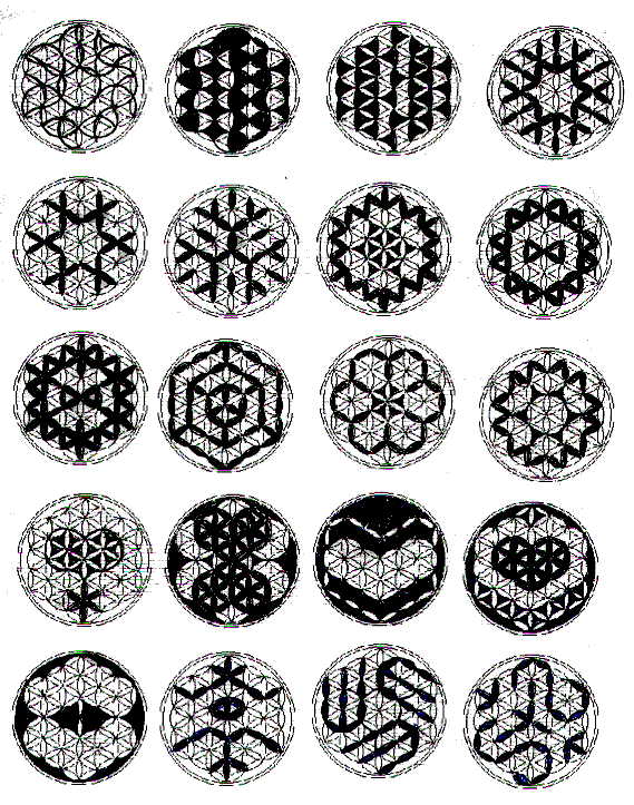 Aus dem Grundmuster der "Blume des Lebens" ergeben sich viele verschiedene andere Muster, indem man bestimmte Linien betont oder bestimmte Flächen ausmalt. Hier ein paar Muster, die man darin erkennen kann. Ich fordere euch auf, es selbst mal zu probieren. Es ist eine wunderbare Mandala-Maler-Tätigkeit. =>Hier habt ihr das noch nicht ausgemalte o.a. 20-fache Muster der "Blume des Lebens" im DIN A4-Format zum Ausdrucken. Schließlich kann man ein so entstandenes Muster, das einem persönlich besonders gefällt, vergrößern, bunt ausmalen und dann eine Folie drüber legen und in WindowColors als Fensterbild machen. Dazu muß man zuerst die Linien mit einer Farbe erstellen, 2 Stunden trocknen lassen, und dann die Flächen mit WindowColors ausfüllen. Sollte mal was daneben gehen, kann man das Bild erst ganz trocknen lassen und dann die falschen Stellen auf einem Teller mit einem Messer herausschneiden und nochmal richtig mit WindowColors erstellen.