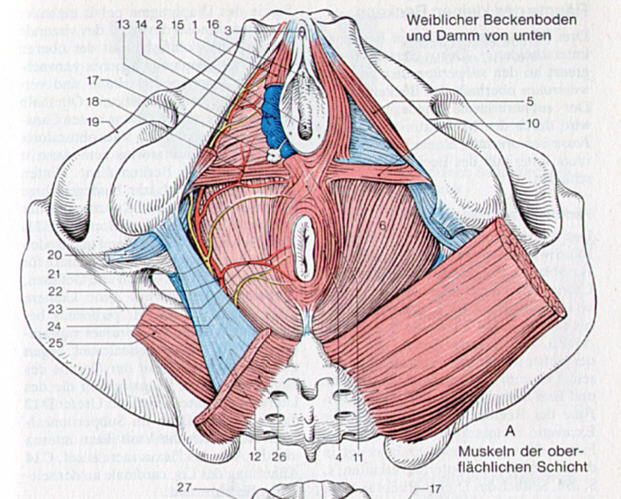 Schamlippen genannt. Im Zentrum des Dammes liegt eine sehnige Platte, Centrum